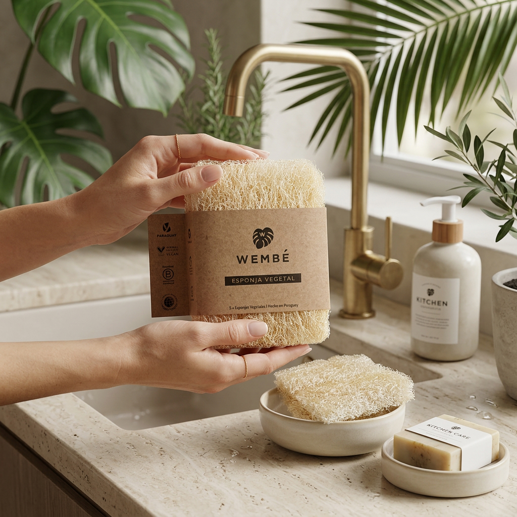 Esponja natural de origen vegetal, ideal para la limpieza diaria de la cocina. Limpia de forma eficaz sin rayar superficies y es una alternativa responsable a las esponjas sintéticas.